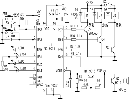 功能介绍 附图为消毒柜控制器电原理图。LED1、LED2为臭氧消毒指示灯,LED3、LED4为加热指示灯。开机时所有指示灯均熄灭,按一下AN1则LED1亮,J3吸合,臭氧发生器开始工作;45分钟后,LED1熄灭,LED2点亮;45分钟后,LED2熄灭,LED3点亮,同时J3释放,J2吸合,臭氧消毒结束,进入加热干燥阶段。30分钟后,LED3熄灭,LED4点亮,再经过30分钟后LED4熄灭,J2释放,整个消毒、加热干燥过程结束。需要不同种类的消毒、加热干燥时,可以通过按AN1进行选择,每按一次AN1,点亮的LED指示灯下移一位,只进行余下的消毒、干燥程序。本消毒柜有四种消毒干燥程序: