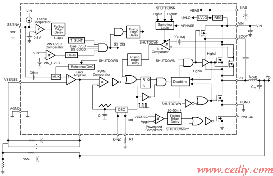 TPS54310是美国TI公司推出的集成功率MOSFET的直流/直流变换器IC系列SWIFT的新成员,3V 至 6V输入,0.9V 到 3.3V可调输出,连续额定电流达3A。TPS54310集成了构成同步整流BUCK型DC-DC模块所有需要的有源器件, 内部电路框图见(图1)。