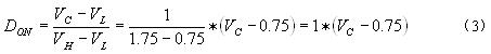 TPS54310内部采用电压模式的脉宽调制器,PWM比较器把误差放大器输出的控制电压与振荡器产生的锯齿波电压进行比较以产生所需的接通占空比DON,如(图4)所示。查TPS54310数据手册中的关键特性参数表可得, VL=0.75V,VH=1.75V,所以