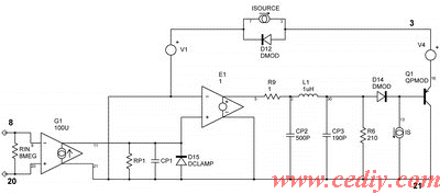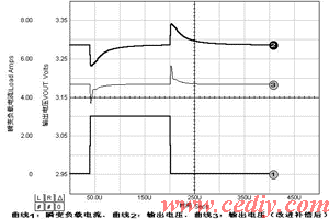 下面,利用前面所建的TPS54310平均 SPICE模型对TI公司提供的演示板电路进行全面的仿真分析。直流和交流小信号分析的仿真电路见(图12),直流工作点标注在图上。得到的系统的开环频率特性(幅频和相频)见(图 13)。环路增益交越频率为44KHz,过0dB 时,相移为83.1度,证明该电源系统是稳定的。(图14)是仿真负载瞬态响应和输入音频扰动衰减率的电路图。注意仿真技巧,C3 由(图12)的1kF变为1pF,相当于交流开路节点8和4;同时,L1 由(图12)的1gH变为1pH,相当于交流短路节点8和5,形成闭环。分段线性源ILoad模拟负载电流的瞬间突变(在1us内跳变3A)。(图15)是负载瞬态响应波形。在电源输入端插入1Vac 的交流电压源,在节点9得到如(图16)所示的输入音频扰动衰减率与频率的关系曲线,反映了系统对小信号正弦波输入电压扰动的抑制能力。为了研究系统对负载扰动的抑制能力,在输入音频扰动衰减率与频率的关系曲线负载瞬态响应仿真波形输出端插入1Aac的交流电流源(仿真电路略),在节点9可得到闭环输出阻抗,见(图17)。至此,采用所建的TPS54310平均SPICE模型已对TI公司提供的演示板电路进行了较全面的动态指标的仿真分析,包括稳定性,快速性和抗扰动性,这是TI的设计软件SWIFT™ Designer 2.01所不能给出的。